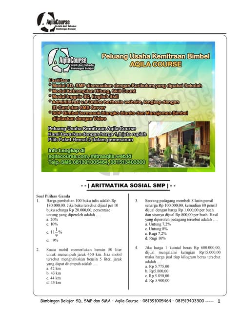 Contoh Soal Matematika Aritmatika Sosial. Soal di bawah ini merupakan soal kombinasi yang melibatkan berbagai pemahaman yaitu brutto, tara, netto, harga pembelian, harga penjualan dan untung rugi. Catatan: Soal matematika ini menguji ranah afektif (kejujuran) seseorang.